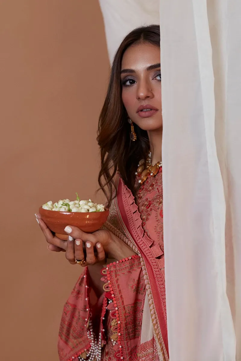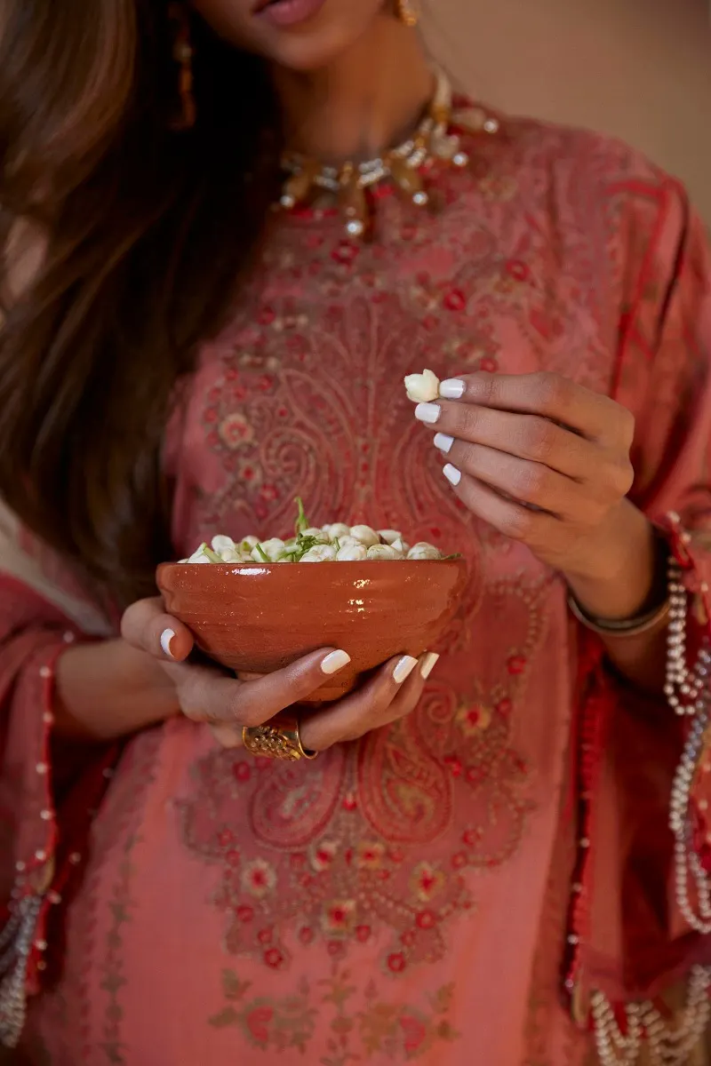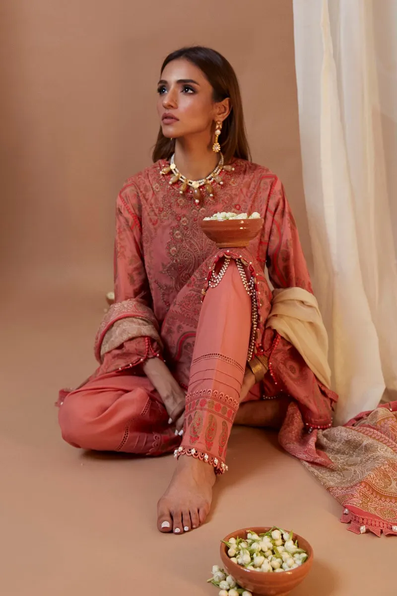Wear this one-of-a-kind ensemble inspired by Indian paisley and South Indian Banarasi saree with beautiful detailing of roselle and gold on an Orient blush shirt. Coupled with matching pants and a finely crafted dupatta to complete this stunning look.
