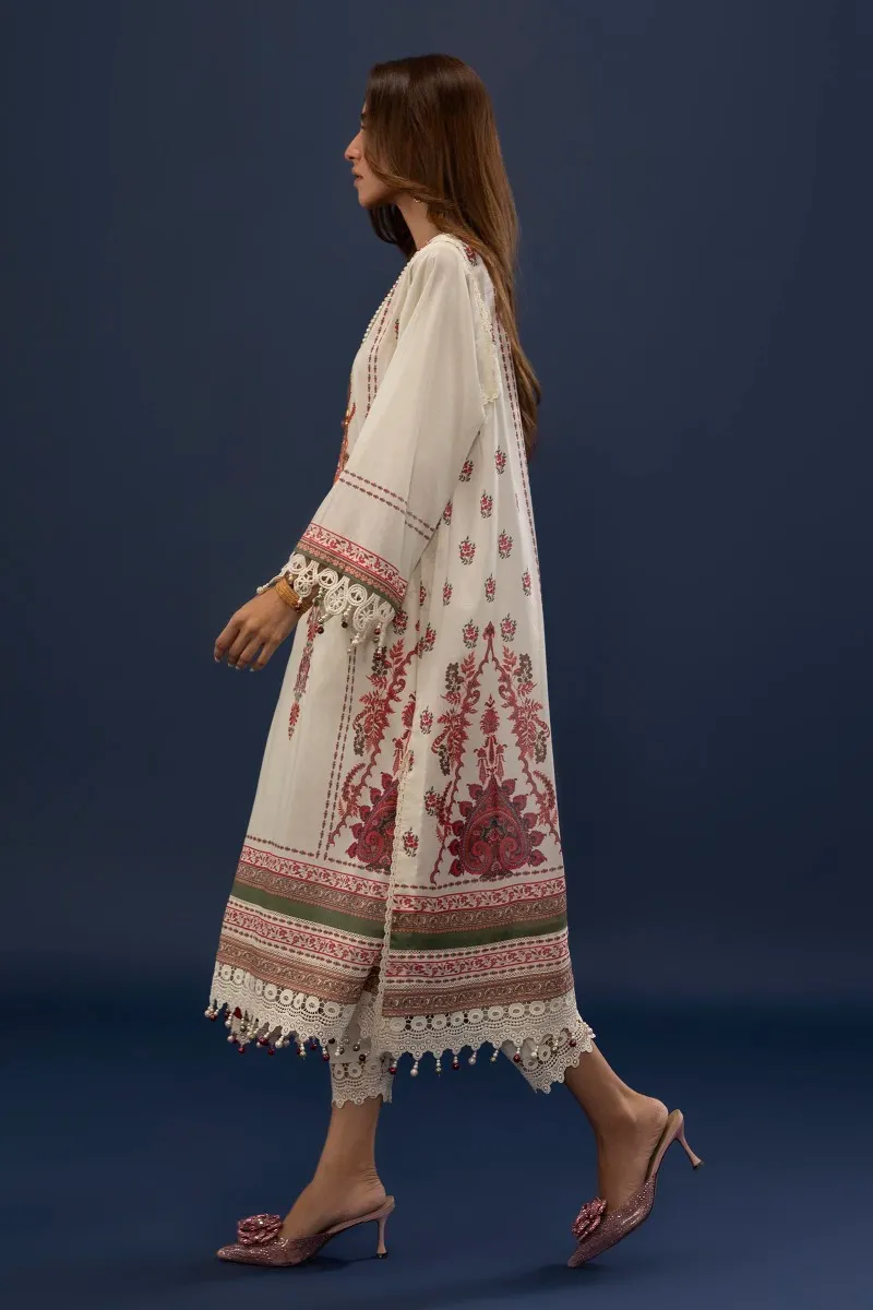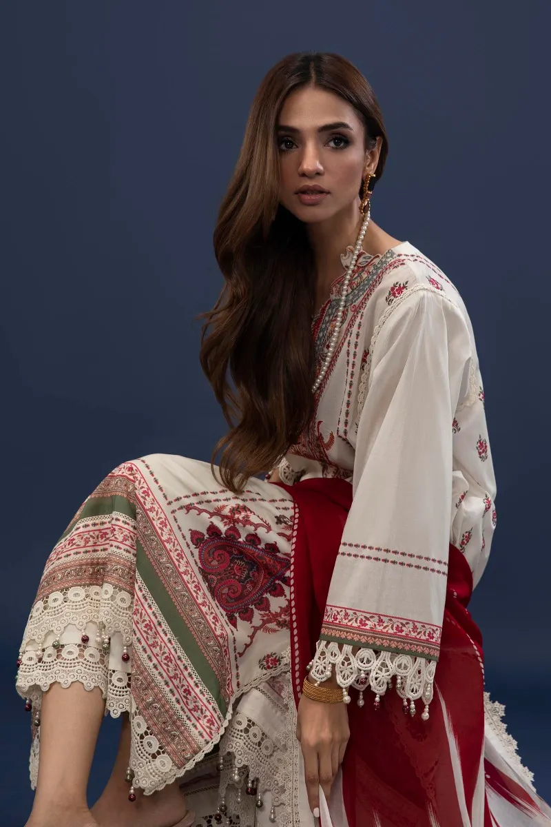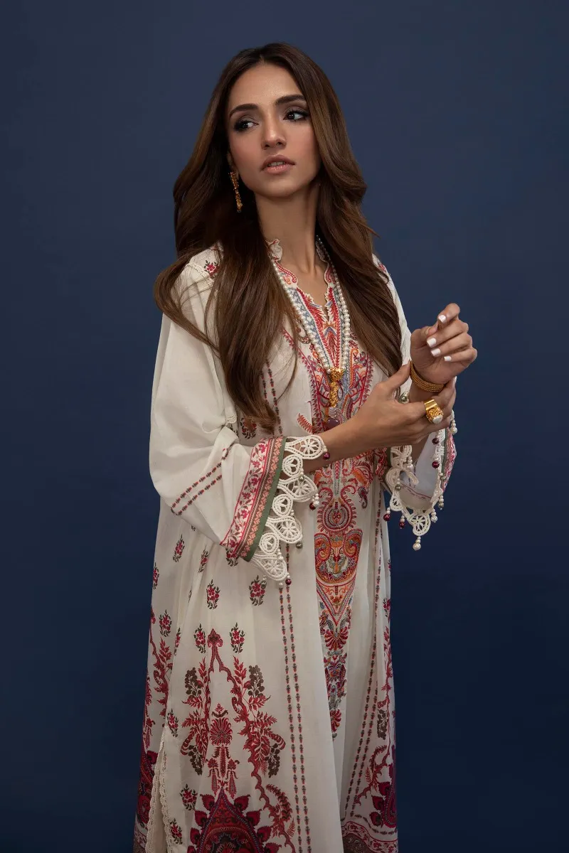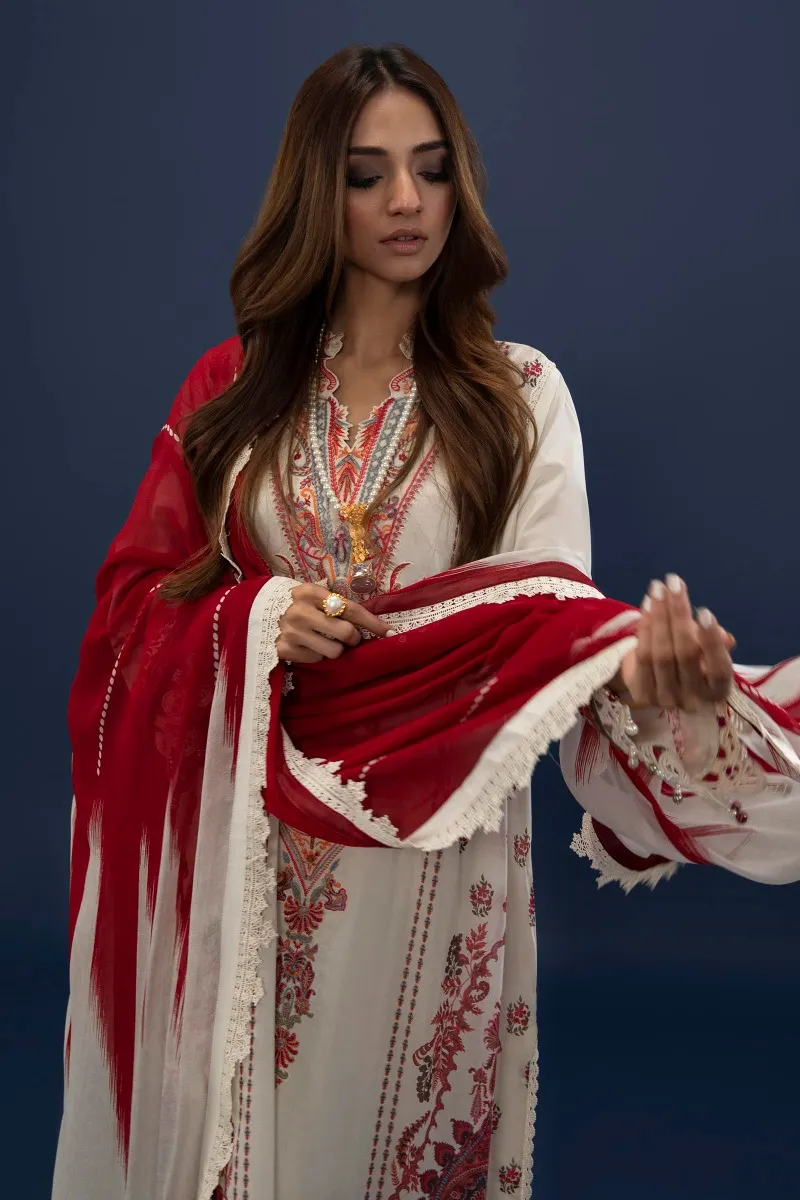 Bringing you the look of the season in almond white, featuring ace artistry in shades of red, orange, and azure. Complemented with matching pants and an ikkat-inspired dupatta that adds a flair to the whole outfit.